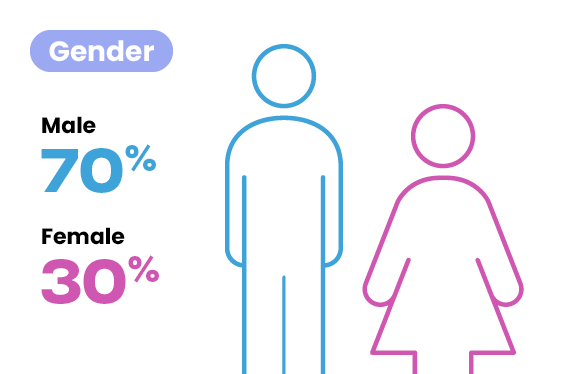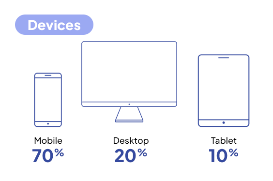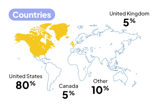 The audience is predominantly female (65%), primarily aged between 45 and 80. Most users are located in the United States (80%), with smaller segments in Canada, the UK, and other countries. Mobile devices are the main access point (70%), followed by desktops (20%) and tablets (10%).
